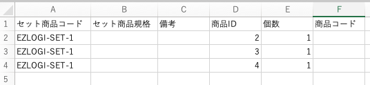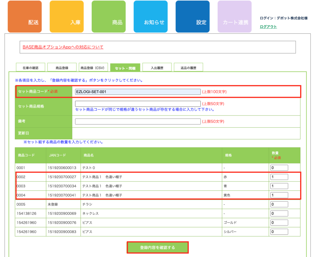 手順2:セット商品コード、セット登録する商品の数量を入力