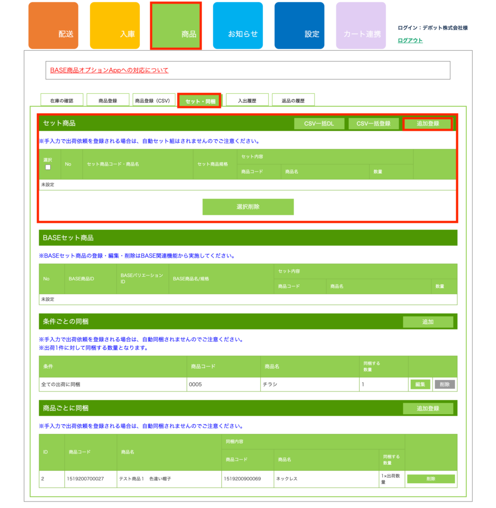 手順1:「商品」>「セット・同梱」ページから「セット商品」の「追加登録」をクリック