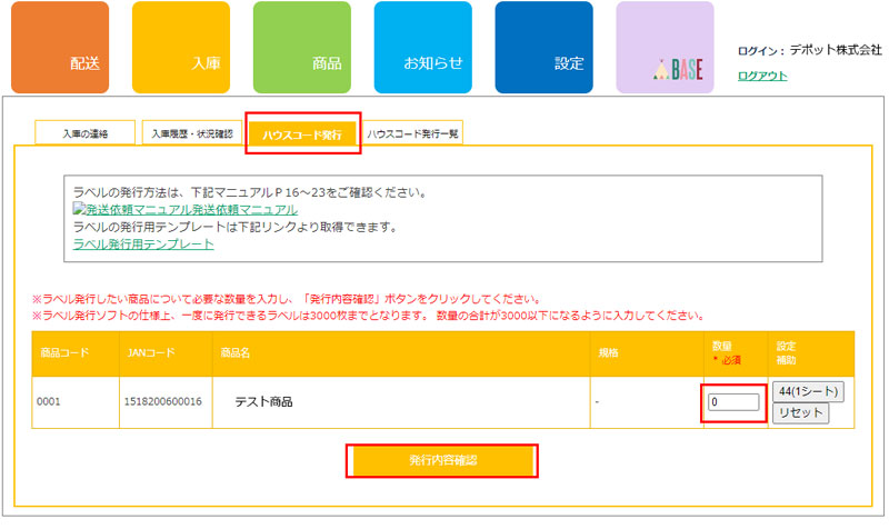 手順1:「入庫」 > 「ハウスコード発行」ページにて、該当商品全てに「数量」を入力し、画面下部の「発行内容確認」ボタンを押してください。