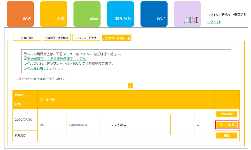 手順3:「入庫」 > 「ハウスコード発行一覧」ページにて、該当発行の「ラベル取得」ボタンを押してください。