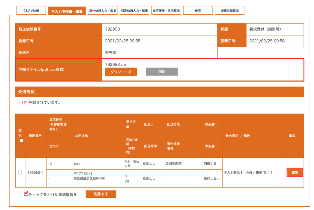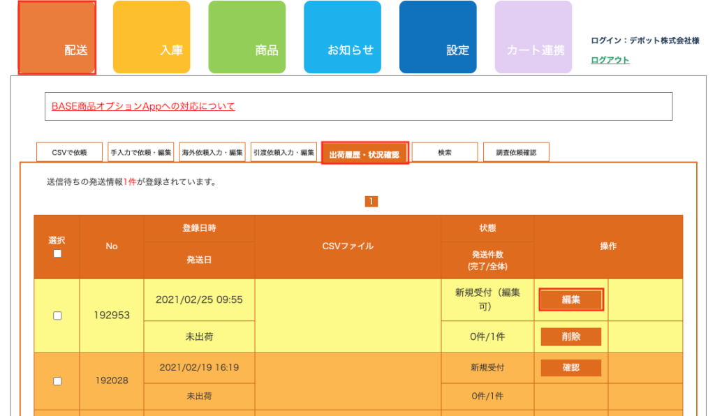 2-1.「出荷履歴・状況確認」ページの該当出荷依頼の「編集」ボタンを押します。