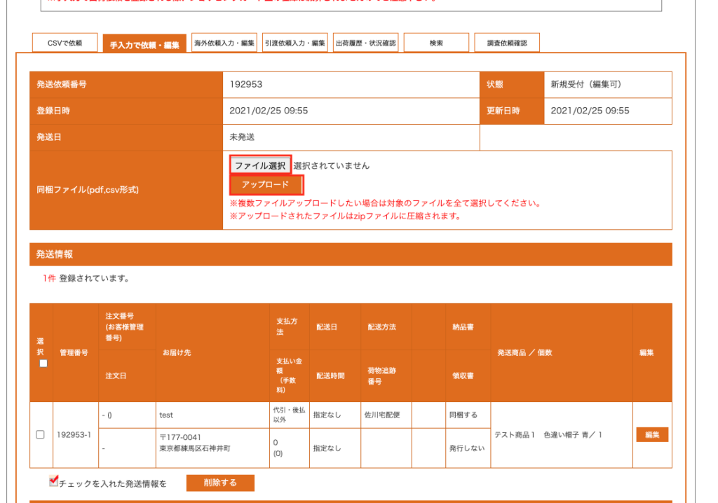 2-2.画面上部の「同梱ファイル(pdf,csv形式)」の「ファイルを選択」ボタンをクリックし、同梱したいファイルを選択し、「アップロード」ボタンをクリック