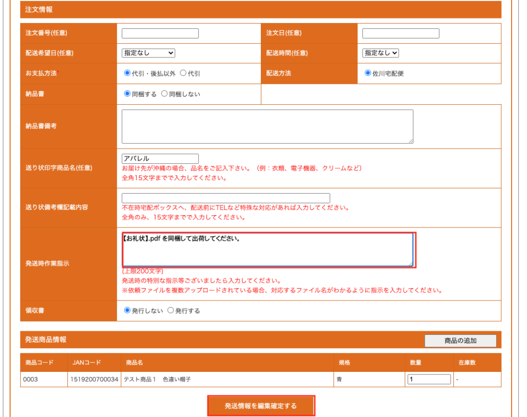 3-2.「発送時作業指示欄」に下記のようにファイル名と同梱指示をご記入ください。