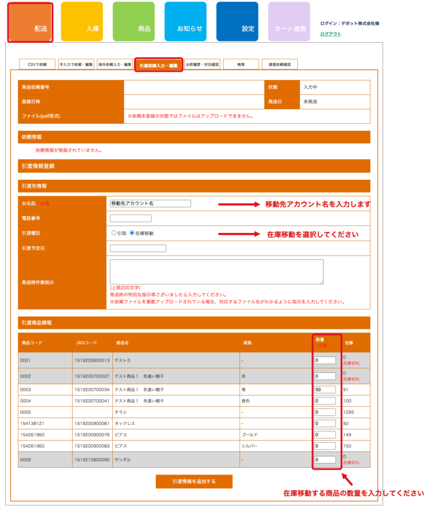 手順1:「配送」>「引渡依頼入力・編集」ページにて在庫移動依頼をご登録ください。