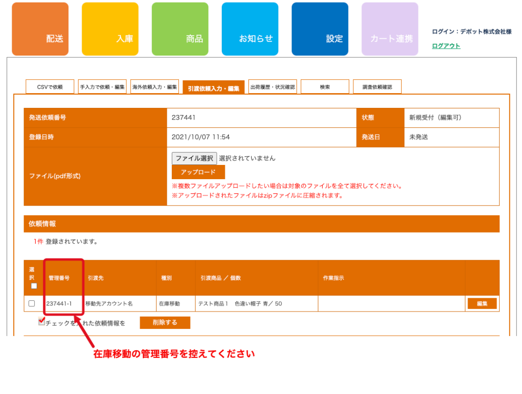 手順2:在庫移動の管理番号を控えてください