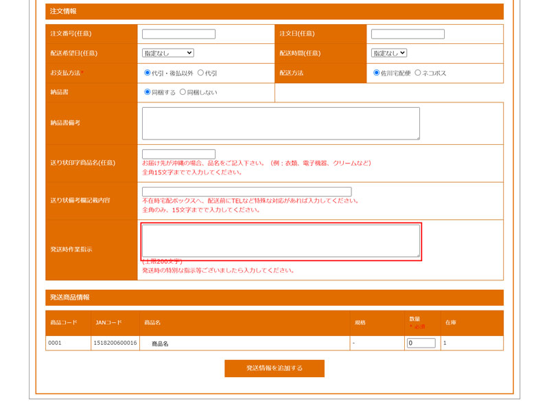 ※梱包に関して必要な手順などございましたら、「発送時作業指示」欄に記入してください。