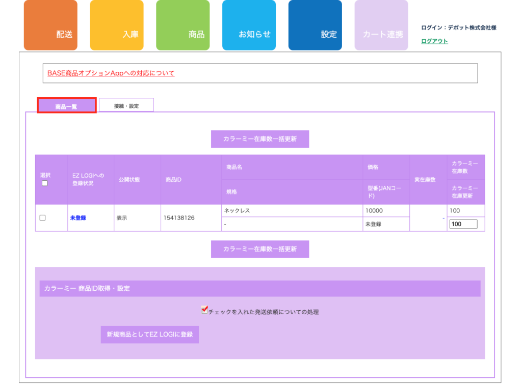 カラーミーに登録されている商品情報をAPI接続でEZLOGIに反映させる手順になります。