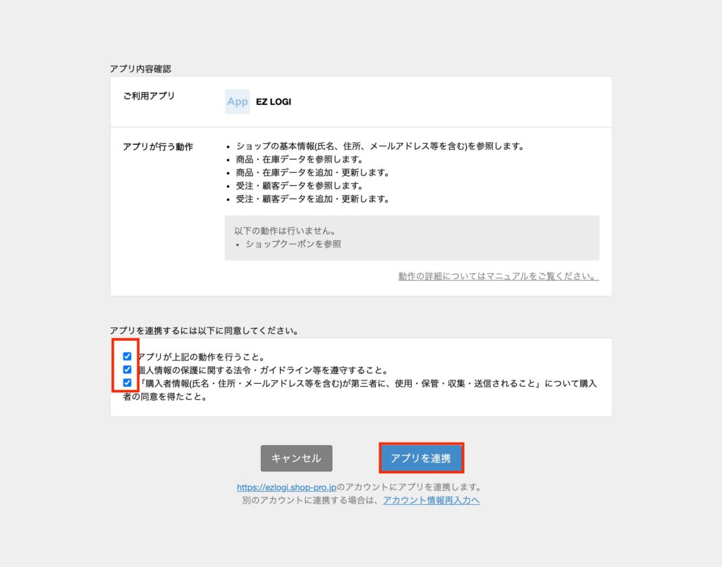 手順3:内容確認後、同意項目のチェックボックスにチェックをして、「アプリを連携」ボタンをクリック