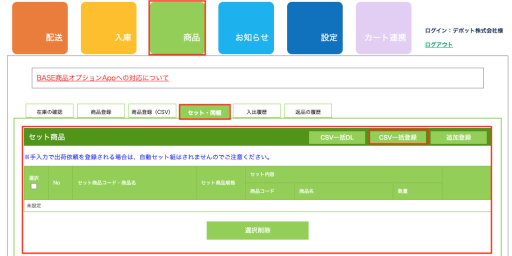 手順1:「商品」>「セット・同梱」ページから「セット商品」の「CSV一括登録」をクリック