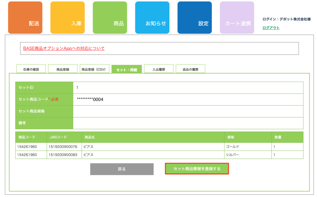 「商品」>「在庫の確認」ページよりセット登録したい商品の情報を参照して入力。