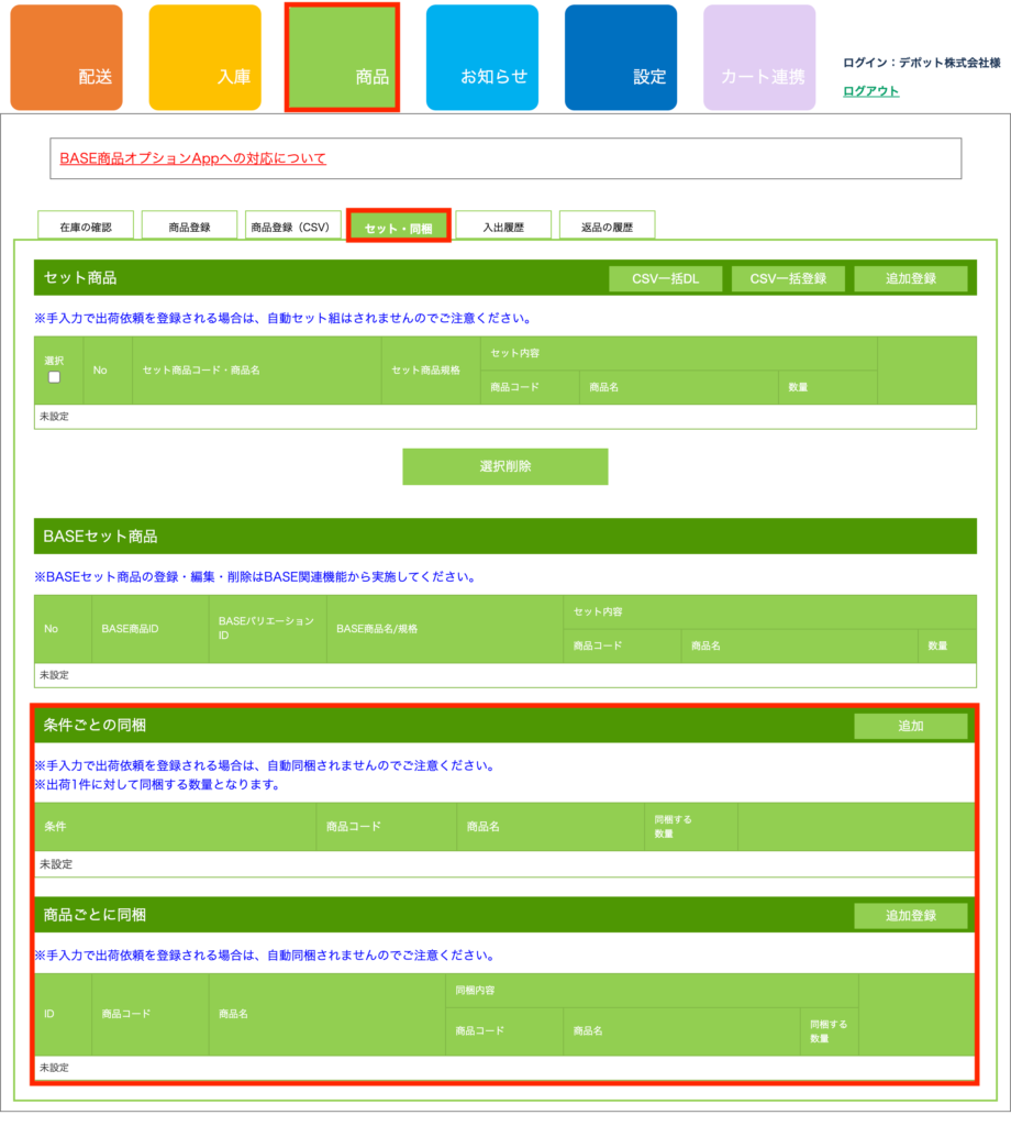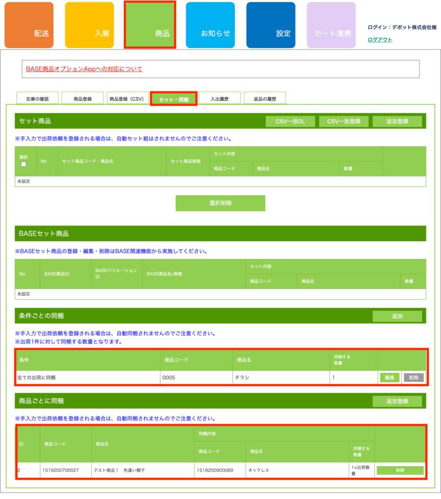 上記で設定した同梱の設定情報は「商品」>「セット・同梱」ページの下部に反映されますのでご確認ください。