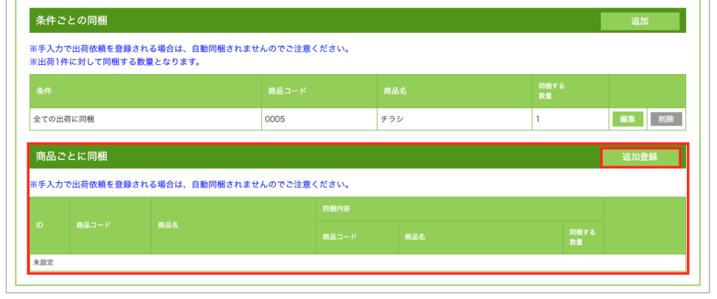 手順1:「商品ごとに同梱」のタブ右上の「追加登録」をクリック