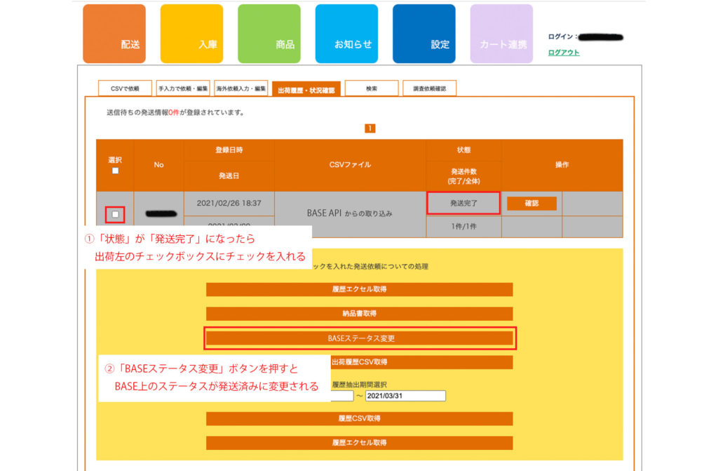 手順3:チェックボックスにチェックを入れ、ページ下部にある「BASEステータス変更」ボタンを押してください。