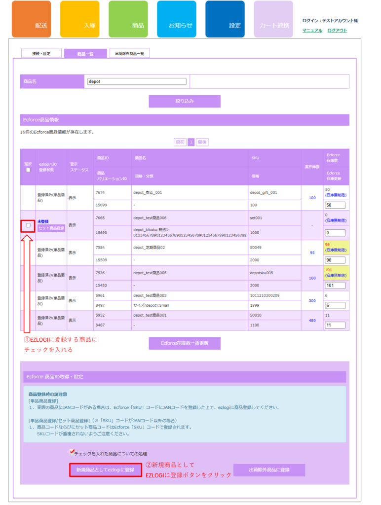 また、後からJANコードを取得してJANコードを更新する場合は、ecforce上とEZLOGI上の必ず両方で更新するようにしてください。