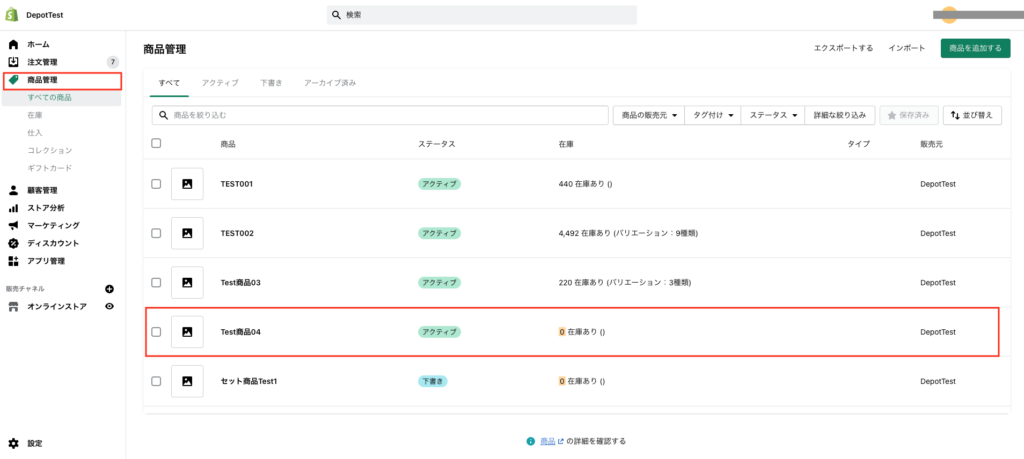 手順1:Shopifyの管理画面にログインし、「商品管理」を選択し、修正する商品をクリック