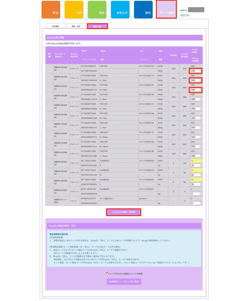 ②該当商品の在庫数を編集し、「Shopify在庫一括更新」ボタンを押してください。