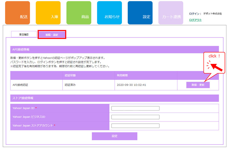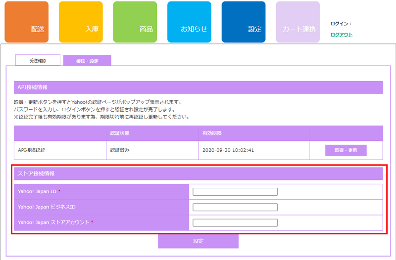 手順1:「カート連携」 > 「接続・設定」ページにて、ストア接続情報を入力し設定ボタンをクリックしてください。